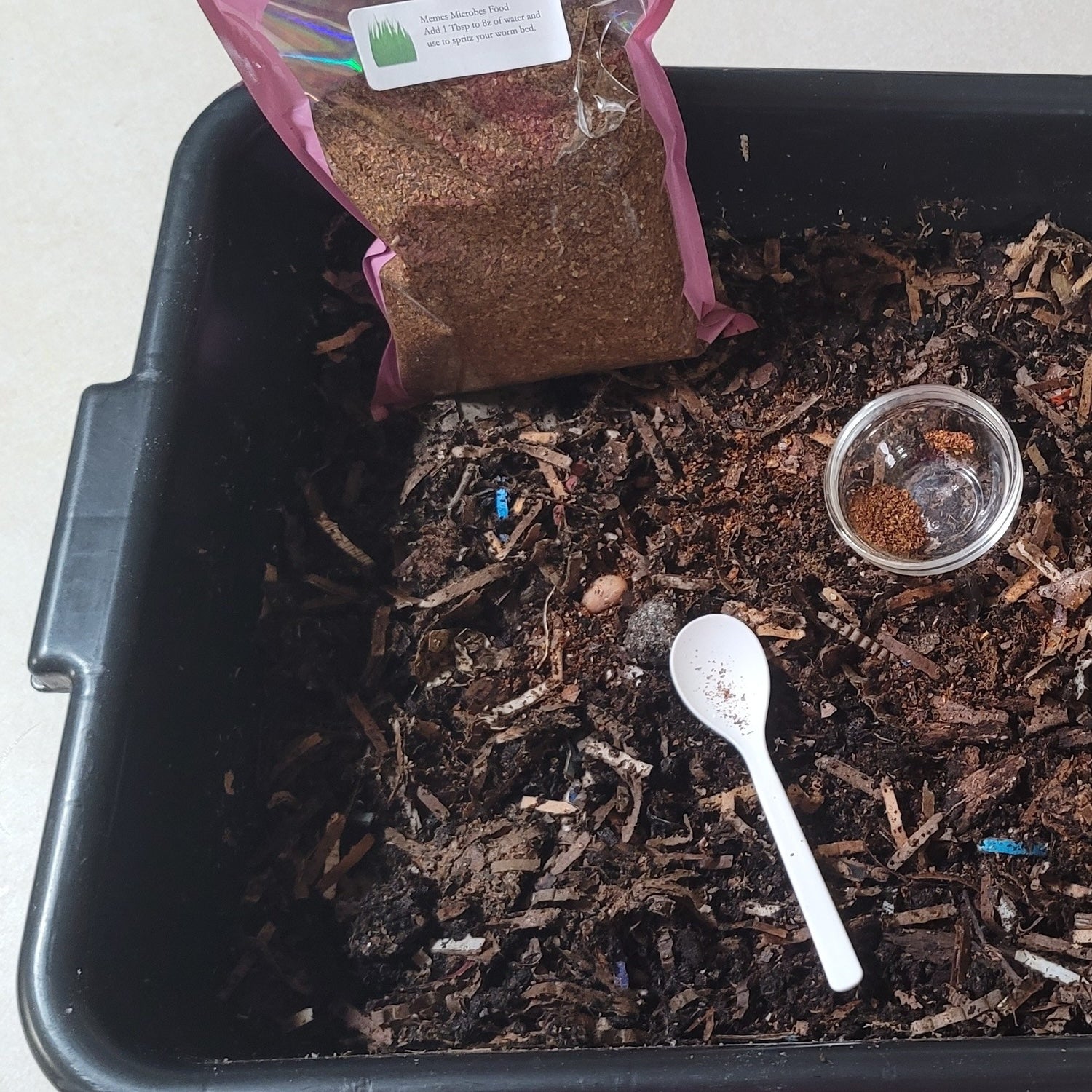 Add 1 tablespoon of Microbial food to the top of your bin and mix it into the top layer of bedding