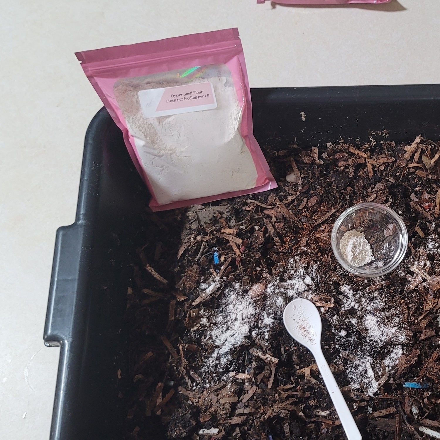 Add 1 tablespoons of Oyster Shell Flour to the top of your bin and mix it into the top layer of bedding